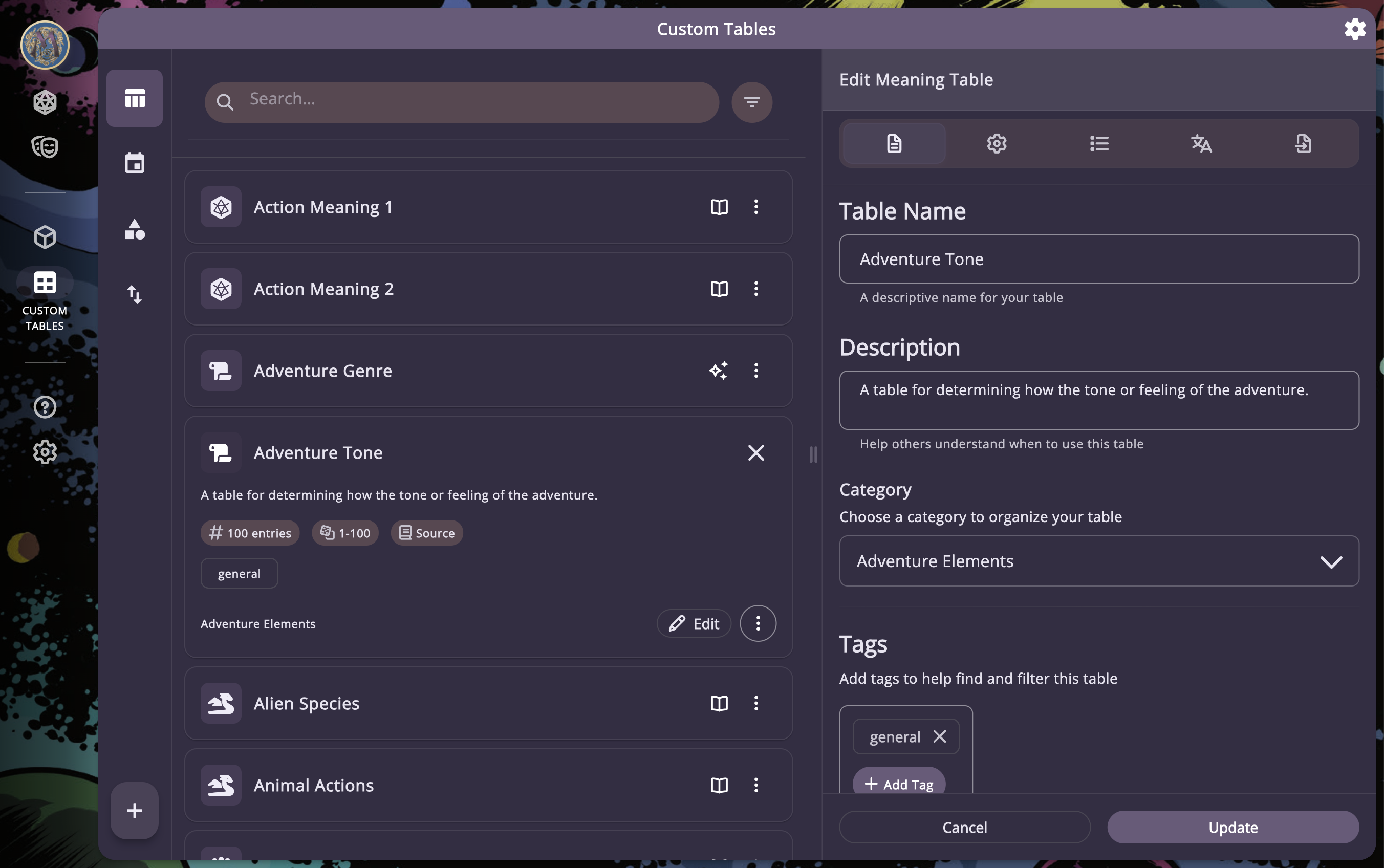 - Custom Tables: Create, import, link, and export your own oracles in CSV/JSON/PSV—your tables, your language, your world.